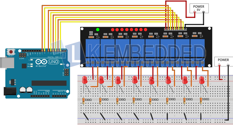 1 2 3 4 5 6 7 8 9 10 11 12 13 14 15 16 17 18 19 20 21 22 23 24 25 26 27 28 29 30 | #define RELAY_CH1 2 #define RELAY_CH2 3 #define RELAY_CH3 4 #define RELAY_CH4 5 #define RELAY_CH5 6 #define RELAY_CH6 7 #define RELAY_CH7 8 #define RELAY_CH8 9 int pins[] = {RELAY_CH1, RELAY_CH2, RELAY_CH3, RELAY_CH4, RELAY_CH5, RELAY_CH6, RELAY_CH7, RELAY_CH8}; void setup() { for (int i = 0; i < 8; i++) { pinMode(pins[i], OUTPUT); } } void loop() { for (int i = 0; i < 8; i++) { relayOnOff(pins[i]); } } void relayOnOff(int pin) { digitalWrite(pin, LOW); delay(500); digitalWrite(pin, HIGH); delay(500); } |